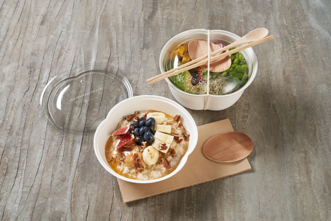 • Schalen und Zuckerrohrfaser-Deckel aus nachwachsendem Material