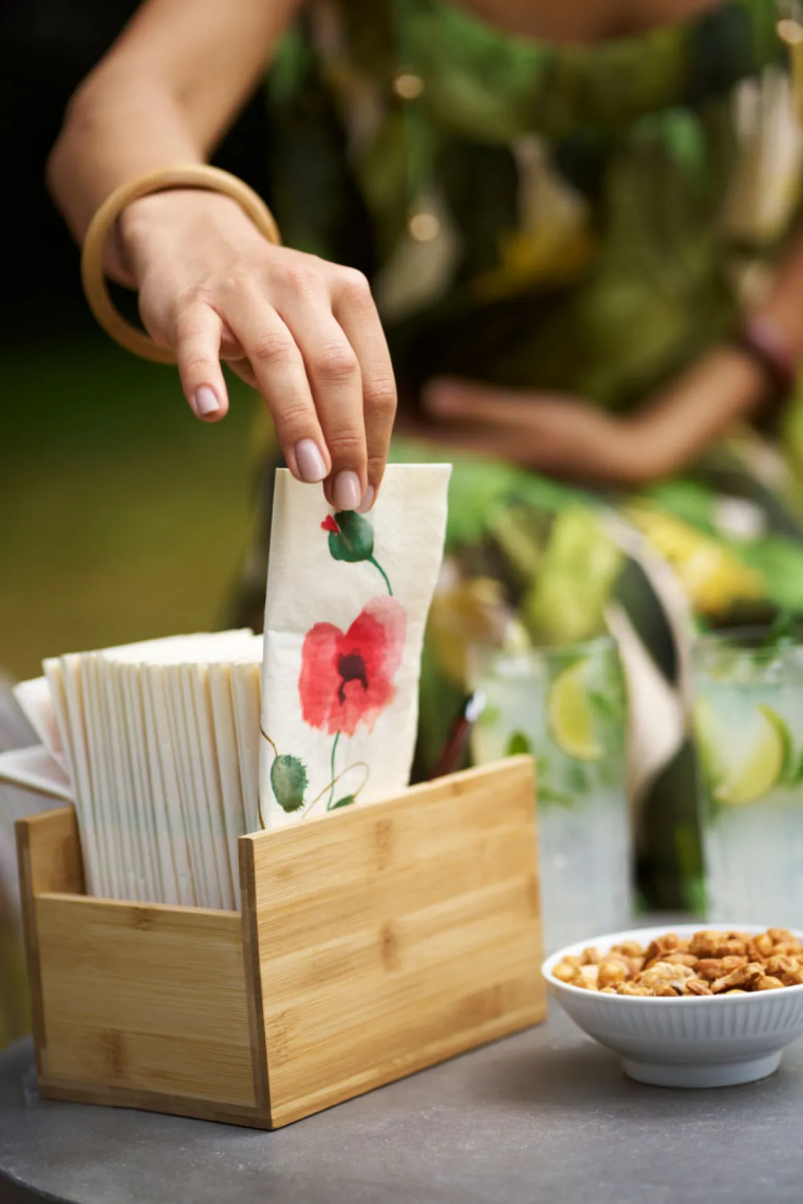 Platzsparend, ideal für Theken und Bars, verhindert Verschwendung von Servietten. Praktische Platzwunder. In den flexiblen Fächern finden Servietten, Besteck, Salz und Pfeffer etc. problemlos ihren Platz. Hergestellt aus umweltfreundlichem und stylischem Bambus.