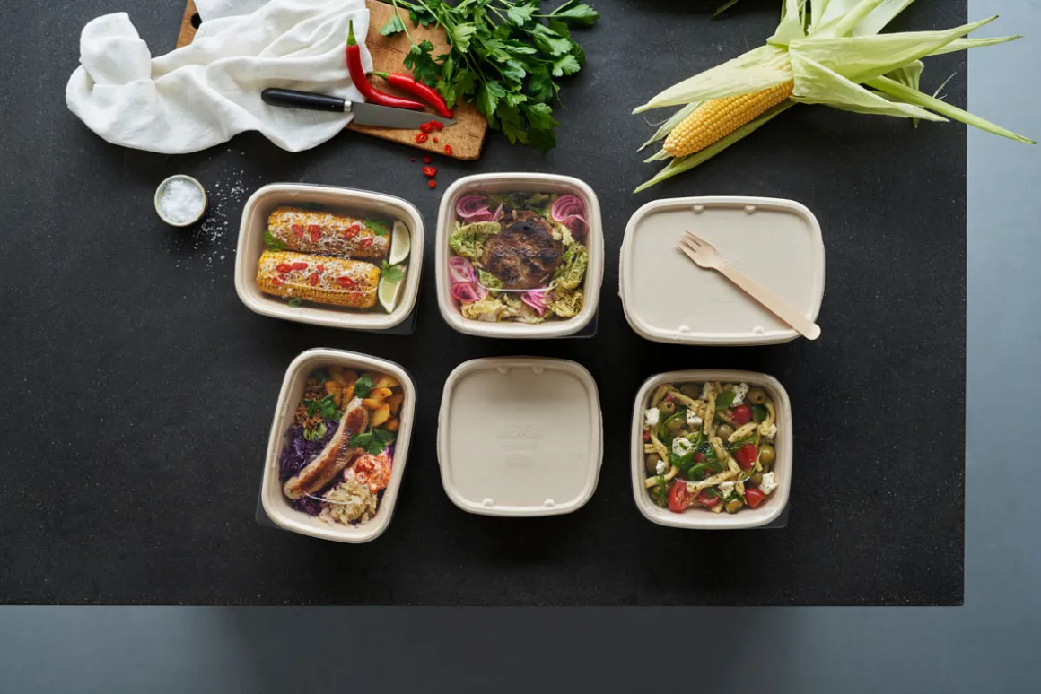 • Boxen und Zuckerrohrfaser-Deckel aus nachwachsenden Rohstoffen