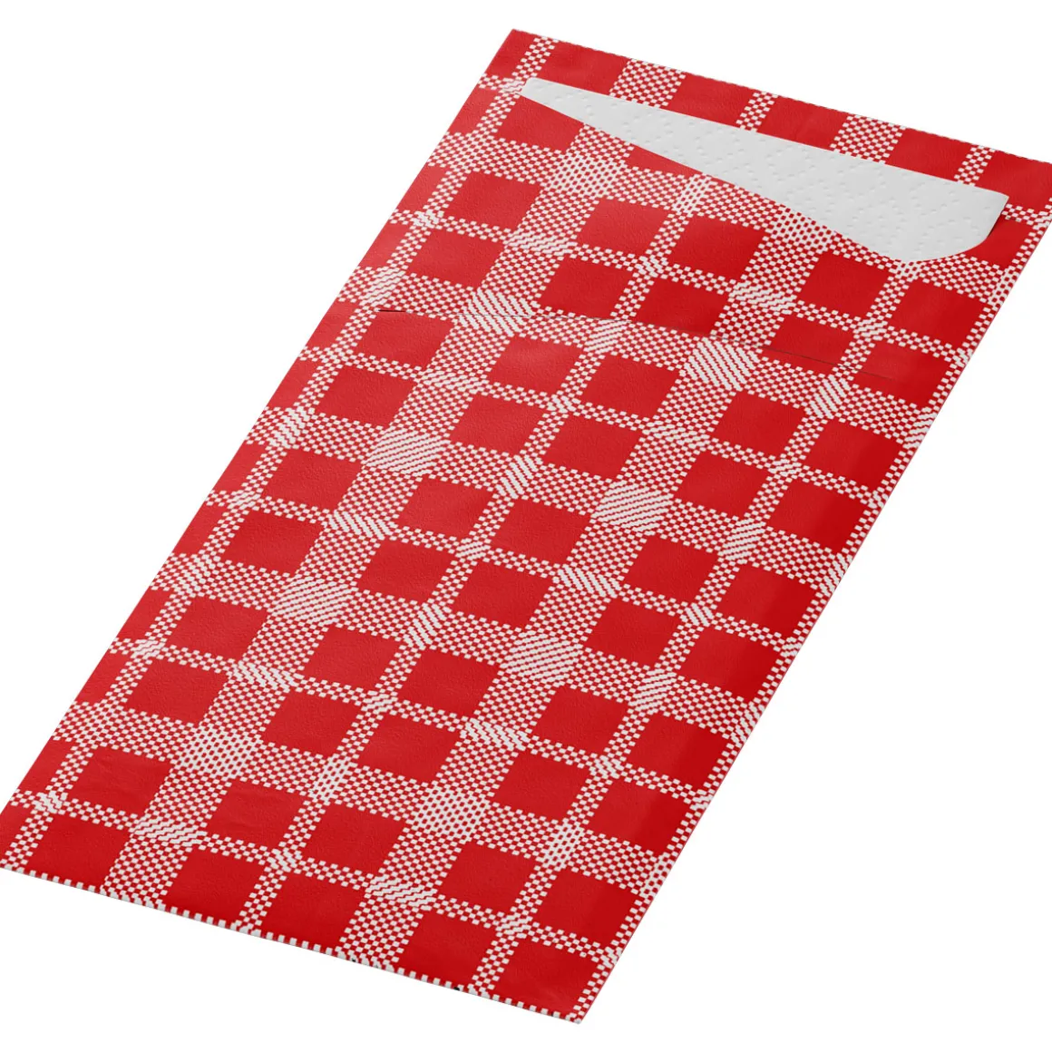 Hygienische und praktische Serviettentaschen. Eine praktische und simple Lösung, um das Besteck- und Servietten-Handling zu vereinfachen. Schnell und einfach vorbereitet und eingedeckt – auch in Stoßzeiten. Tolle Lösung für den Innen- und Außenbereich. In vielen verschiedenen Designs verfügbar. Enthält eine 2-lagige, kompostierbare Zelltuch-Serviette (33 × 33 cm).