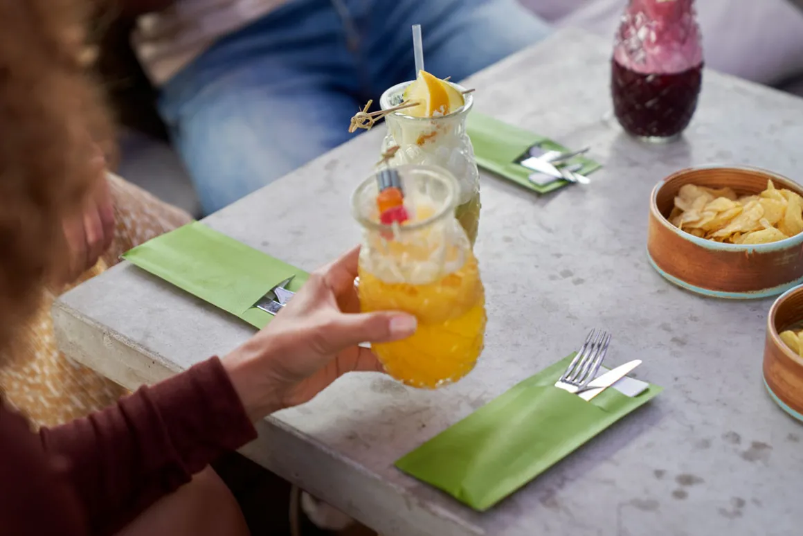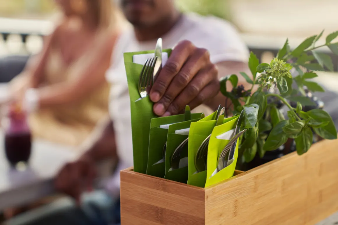 Hygienische und praktische Serviettentaschen. Eine praktische und simple Lösung, um das Besteck- und Servietten-Handling zu vereinfachen. Schnell und einfach vorbereitet und eingedeckt – auch in Stoßzeiten. Tolle Lösung für den Innen- und Außenbereich. In vielen Ton-in-Ton-Farben erhältlich. Enthält eine 2-lagige, kompostierbare Zelltuch-Serviette (33 × 33 cm).