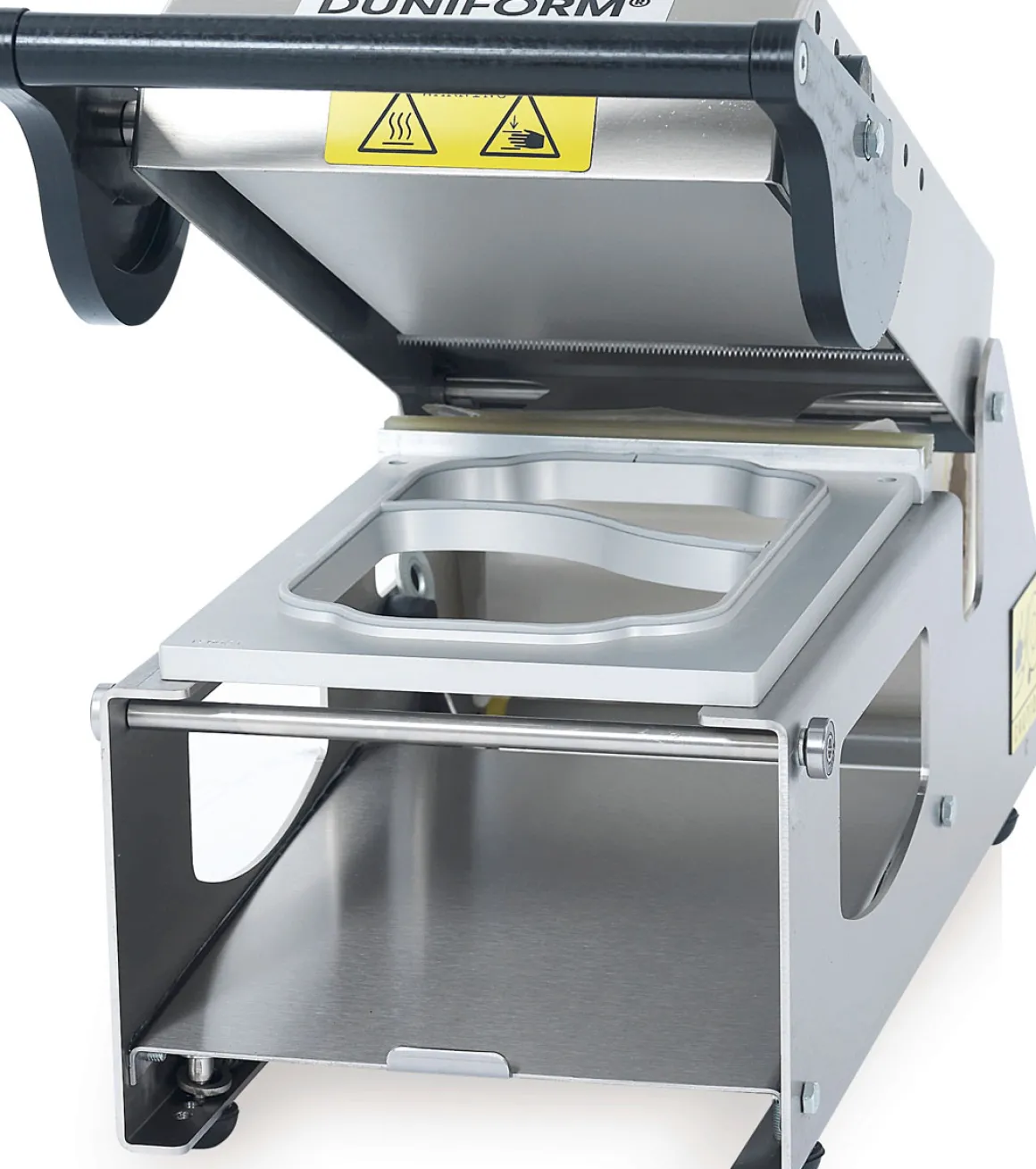 Die manuellen Duniform®-Siegelmaschinen bieten Restaurants, Cafés und Lebensmitteleinzelhändlern die perfekte Einsteiger-Siegelmaschinen zum einfachen und schnellen Versiegeln von Schalen. Einfach die zu versiegelnde Folie einlegen, Folie über die Schale ziehen und den Deckel schließen, um den Siegelvorgang zu starten. Die Kassetten können schnell und einfach gewechselt werden, was eine große Flexibilität bei der Auswahl Ihrer Schalen ermöglicht. Die Maschinen sind aus Edelstahl gefertigt und damit robust und langlebig.