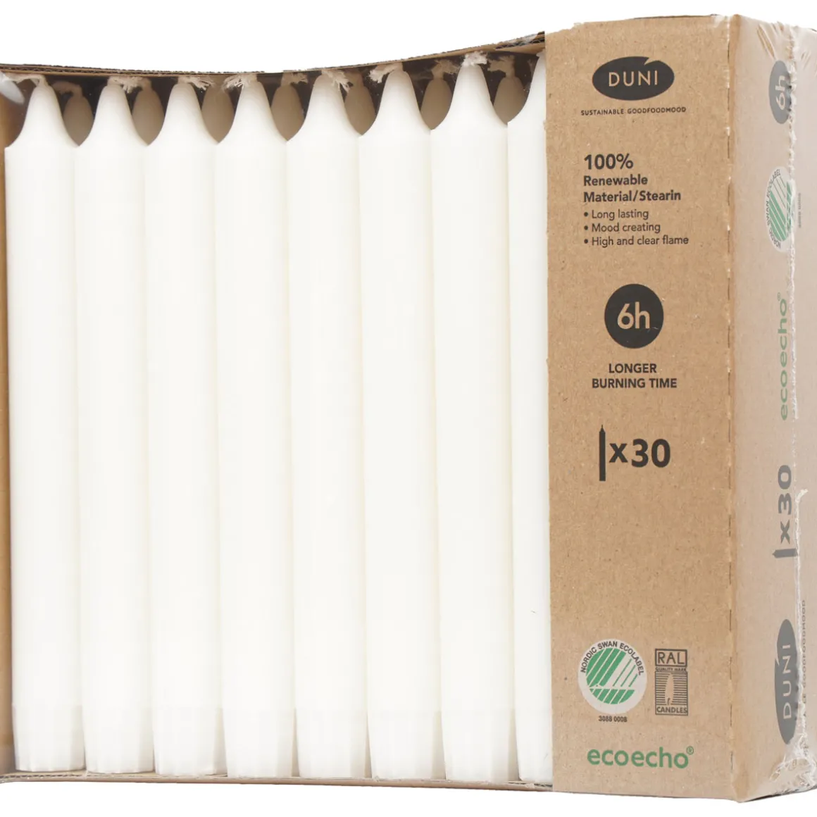 Unsere großen, schlanken Kronenkerzen erzeugen mit ihren großen Flammen eine warme, schmeichelhafte Beleuchtung Ihrer Tafel und der Gesichter Ihrer Gäste. Es gibt sie in vielen verschiedenen Unifarben. Dank des erneuerbaren, rückverfolgbaren Stearins brennen sie bis zum Ende jeder Veranstaltung sauber ab und senken gleichzeitig die Umweltbelastung.