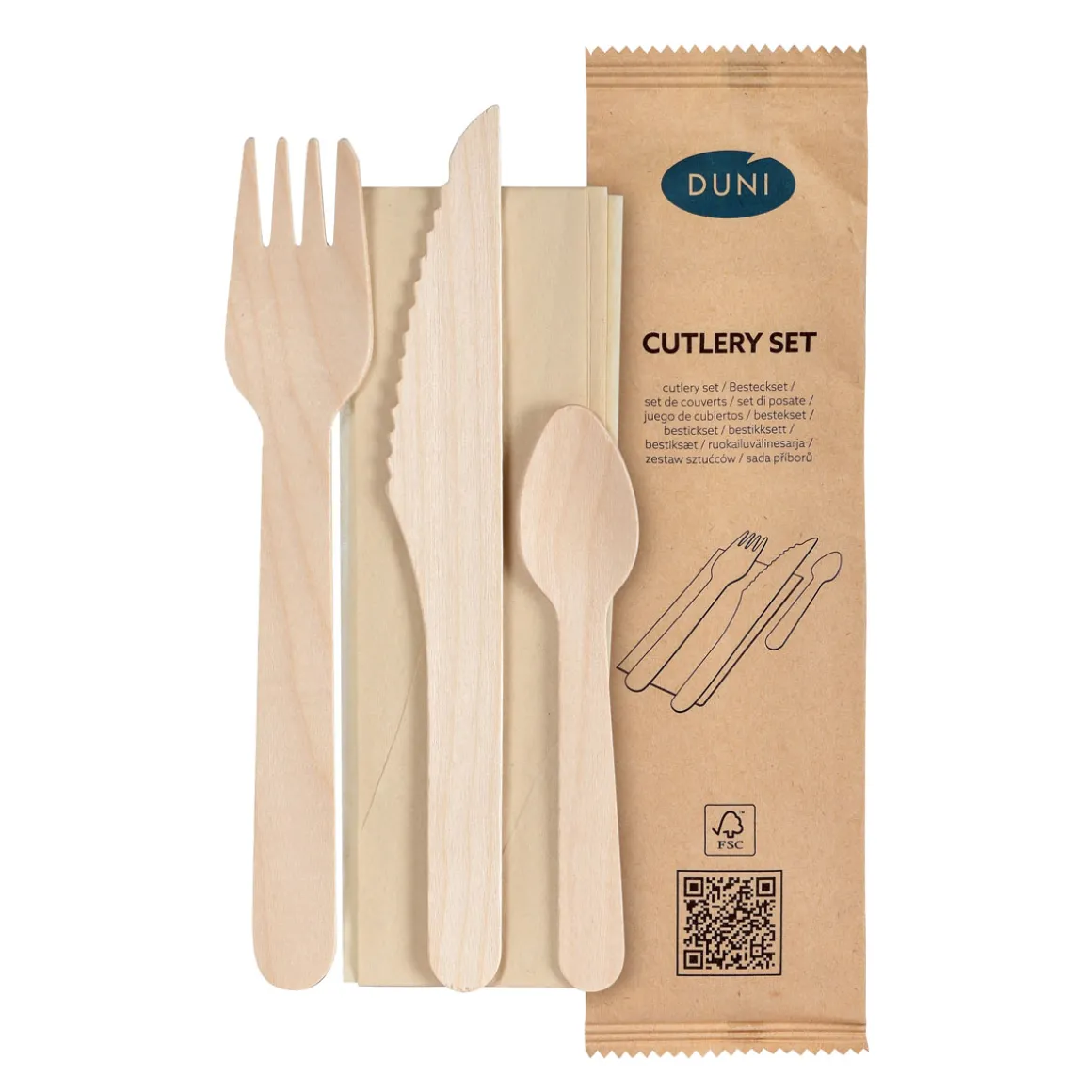 Für eine hygienisch sichere und ideale Bestecklösung für unterwegs bieten wir ein vielseitiges Sortiment an Holzbestecken in verschiedenen Ausführungen an, darunter auch Sets mit FSC™-zertifizierten Zelltuchservietten und Salz- und Pfeffertütchen, die allesamt in FSC™-zertifiziertem Papier verpackt sind. Das Besteck besteht aus FSC™-zertifiziertem Birkenholz und ist für ein angenehmes Mundgefühl mit einer dünnen Schicht Carnaubawachs beschichtet, das vegan und geschmacksneutral ist und umweltschonend geerntet wird.