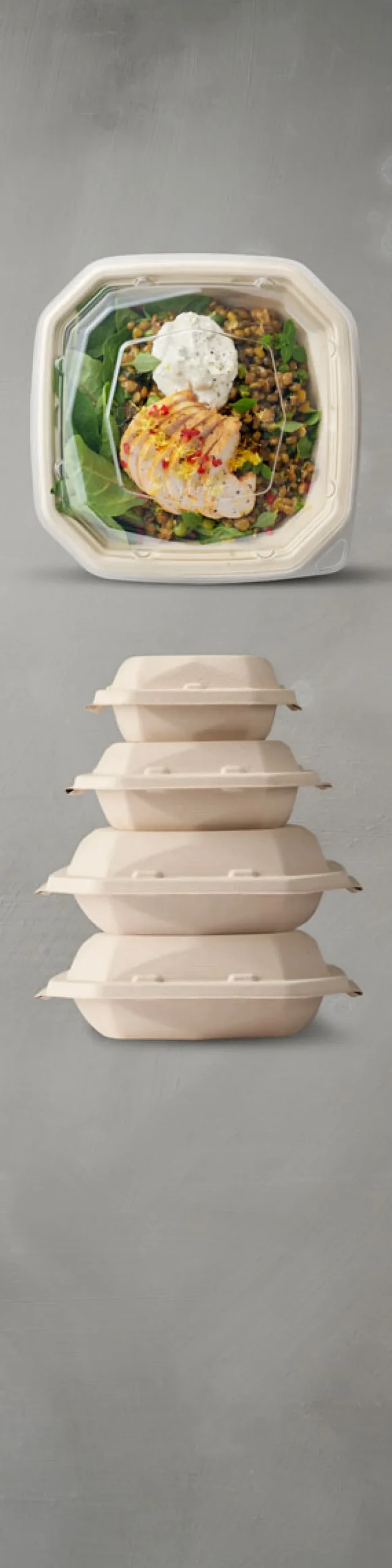 Unsere Octabagasse-Schalen und -Deckel werden aus erneuerbaren und kompostierbaren Zuckerrohrfasern (Bagasse) hergestellt und sind der absolute Favorit bei unseren Kunden. Sie sind ideal, wenn Sie formschönes Design, perfekte Präsentation und Komfort mit herausragender Funktionalität kombinieren möchten. Neben super-sicher schließenden Deckeln aus Zuckerrohrfasern stehen optional transparente Deckel aus 100 % post-consumer recyceltem PET (RPET) zur Verfügung, die nach Gebrauch problemlos wieder recycelt werden können. Unsere Speiseverpackungen – wie all unsere Boxen und Schalen – werden ohne Zusatz von PFAS hergestellt.
