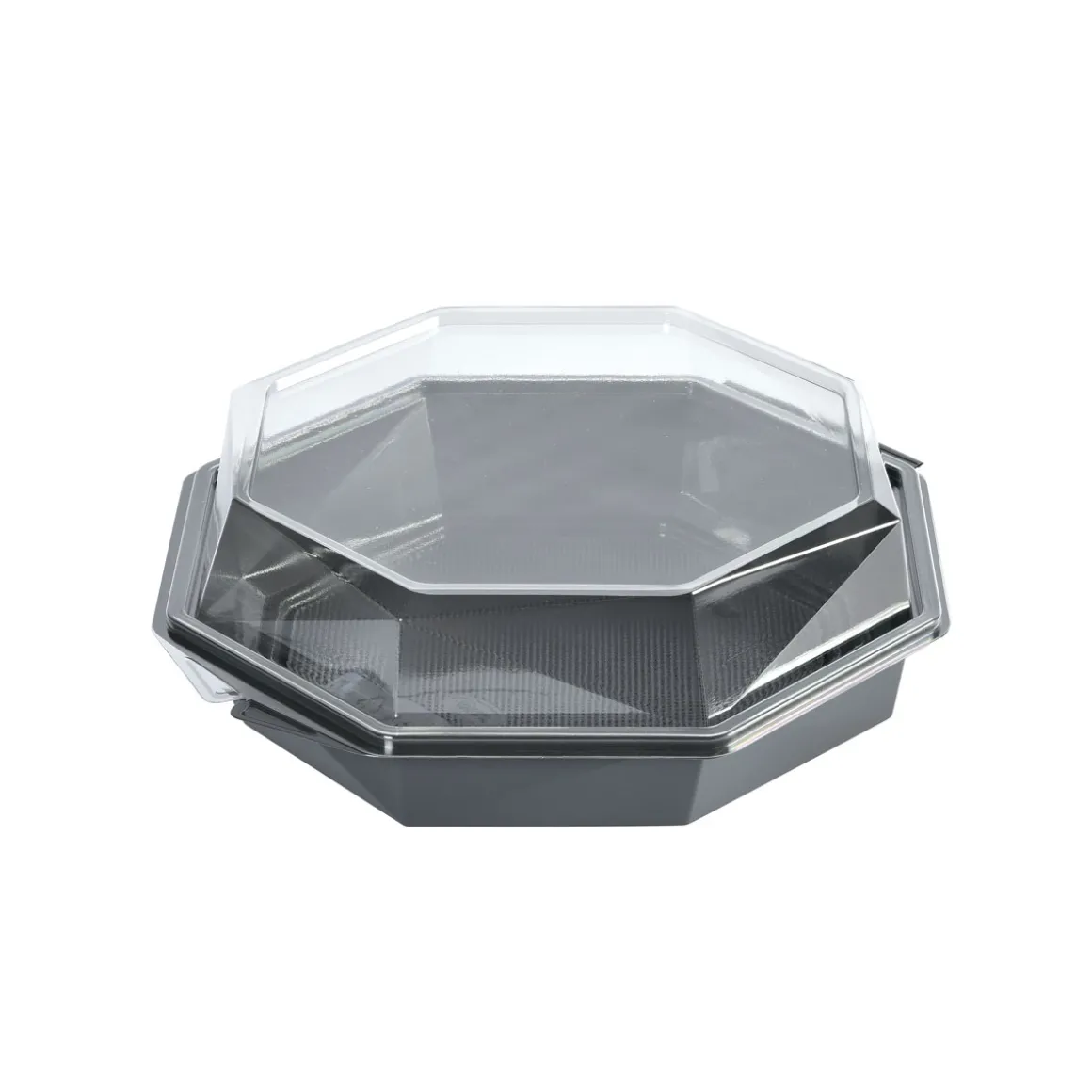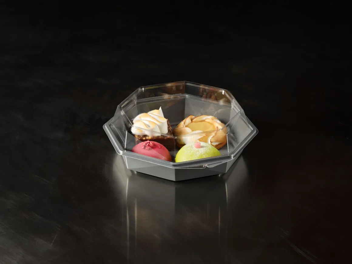 Die Octaview-Take-away-Box schützt frische, kalte Speisen und präsentiert sie gleichzeitig optimal – aus Respekt vor den Lebensmitteln und den Menschen, die sie zubereiten. Sie wurde für Lebensmitteleinzelhändler, Caterer und Feinkosttheken entwickelt und verfügt über einen kristallklaren, beschlagfreien Deckel und einen großen, dunkelgrauen Bereich, der Salate, Sushi, Meeresfrüchte und Wurstwaren hochwertig in Szene setzt. Octaview wird aus APET ohne Ruß hergestellt und reduziert die CO₂-Emissionen um bis zu 78 % über die gesamte Produktpalette hinweg*, wodurch die Sorgfalt im Umgang mit Lebensmitteln mit einer geringeren Umweltbelastung verbunden wird.