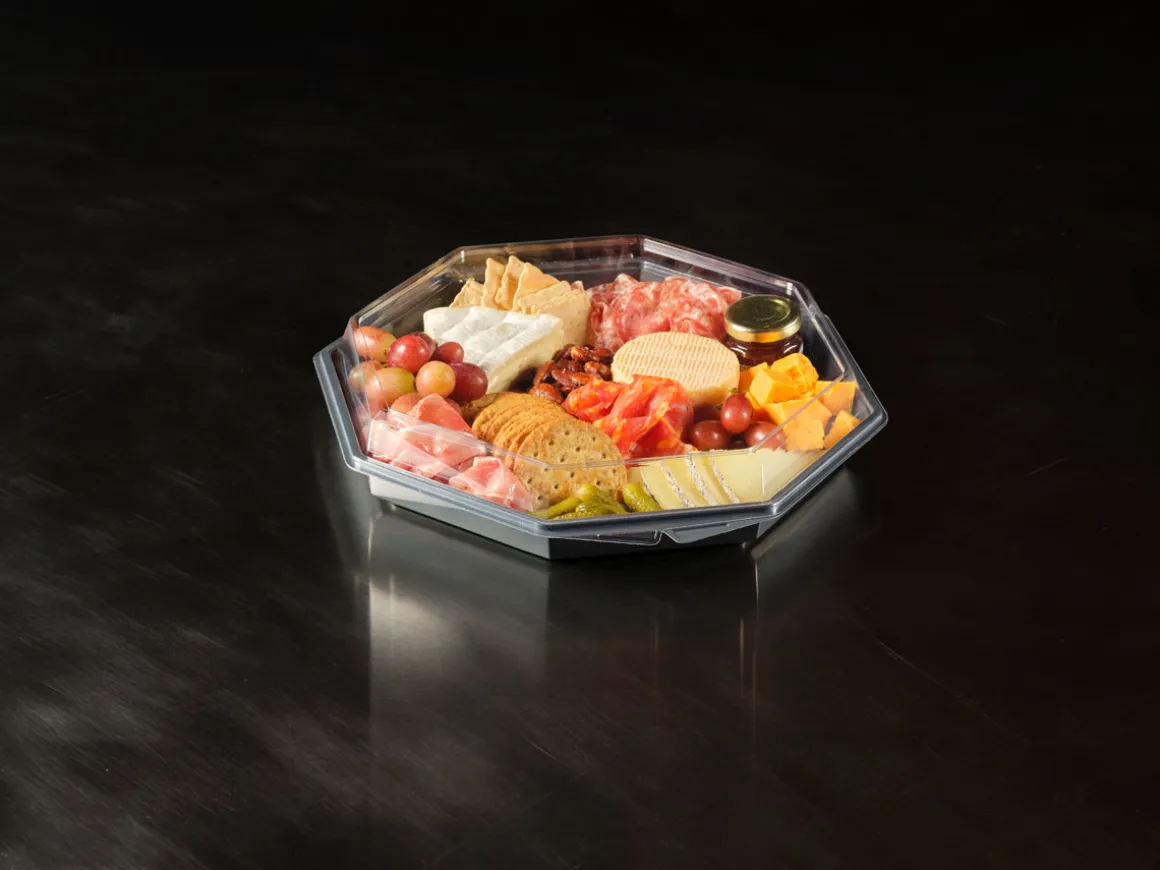 Die Octaview-Take-away-Box schützt frische, kalte Speisen und präsentiert sie gleichzeitig optimal – aus Respekt vor den Lebensmitteln und den Menschen, die sie zubereiten. Sie wurde für Lebensmitteleinzelhändler, Caterer und Feinkosttheken entwickelt und verfügt über einen kristallklaren, beschlagfreien Deckel und einen großen, dunkelgrauen Bereich, der Salate, Sushi, Meeresfrüchte und Wurstwaren hochwertig in Szene setzt. Octaview wird aus APET ohne Ruß hergestellt und reduziert die CO₂-Emissionen um bis zu 78 % über die gesamte Produktpalette hinweg*, wodurch die Sorgfalt im Umgang mit Lebensmitteln mit einer geringeren Umweltbelastung verbunden wird.