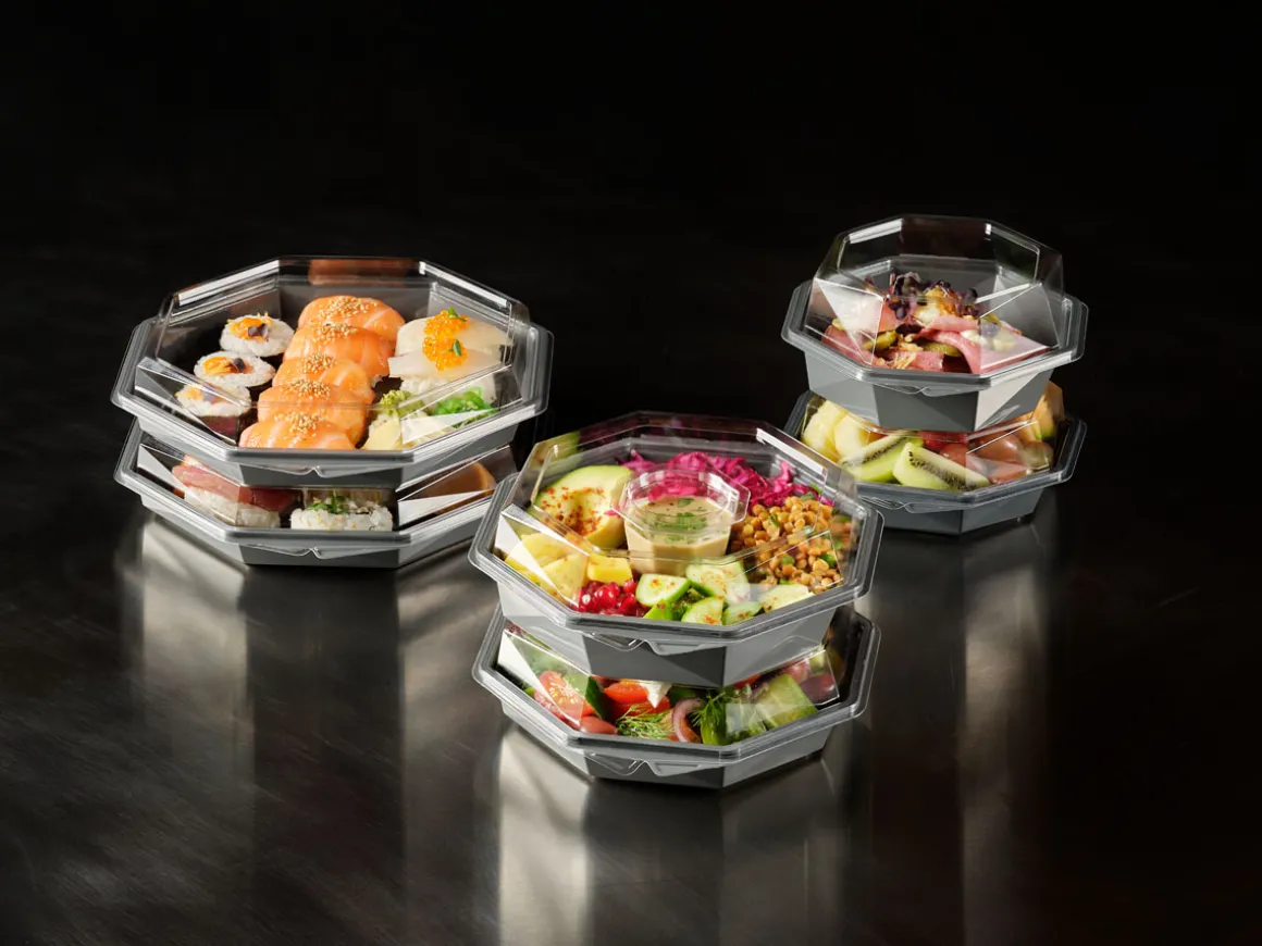 Die Octaview-Take-away-Box schützt frische, kalte Speisen und präsentiert sie gleichzeitig optimal – aus Respekt vor den Lebensmitteln und den Menschen, die sie zubereiten. Sie wurde für Lebensmitteleinzelhändler, Caterer und Feinkosttheken entwickelt und verfügt über einen kristallklaren, beschlagfreien Deckel und einen großen, dunkelgrauen Bereich, der Salate, Sushi, Meeresfrüchte und Wurstwaren hochwertig in Szene setzt. Octaview wird aus APET ohne Ruß hergestellt und reduziert die CO₂-Emissionen um bis zu 78 % über die gesamte Produktpalette hinweg*, wodurch die Sorgfalt im Umgang mit Lebensmitteln mit einer geringeren Umweltbelastung verbunden wird.