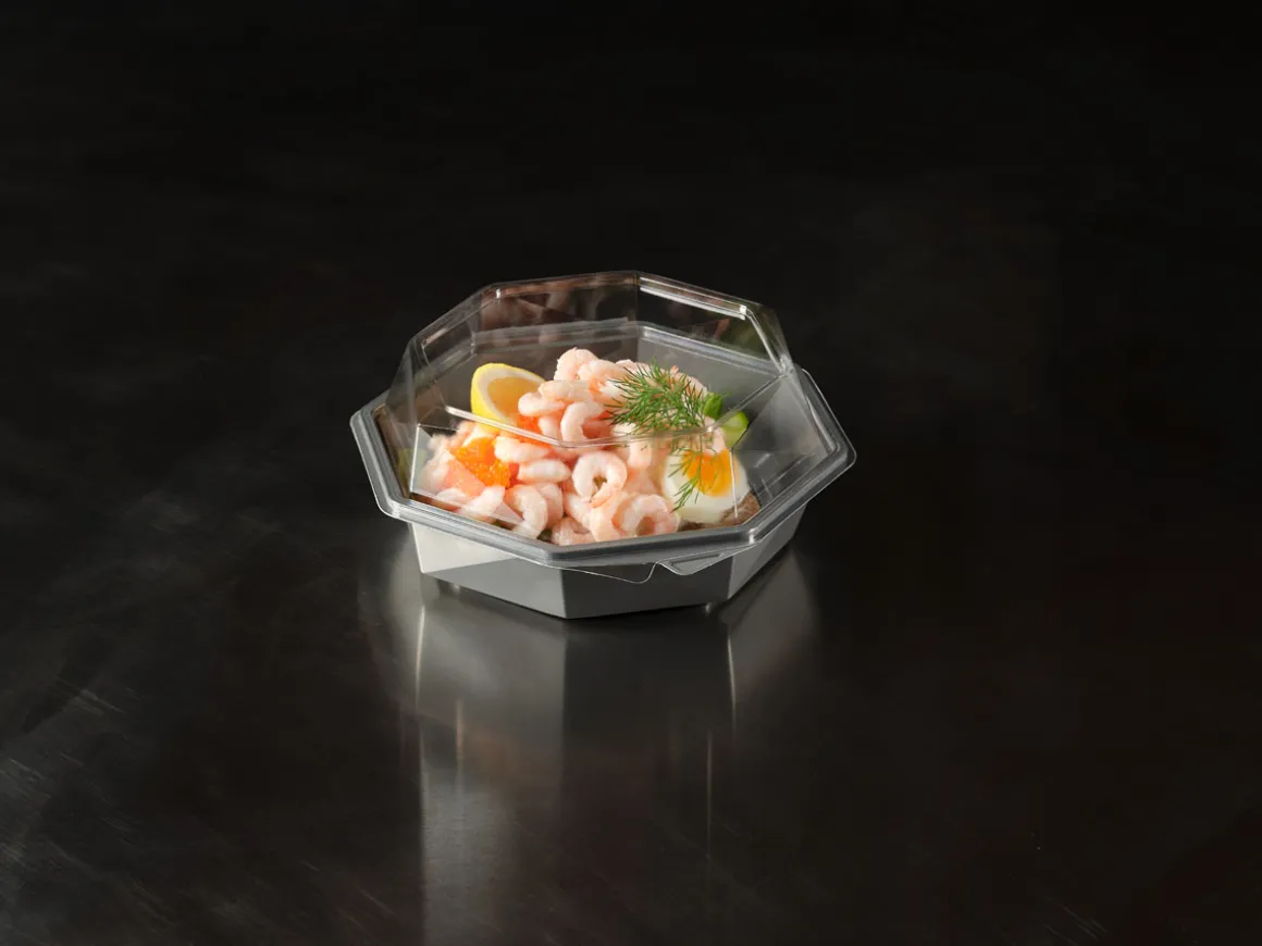 Die Octaview-Take-away-Box schützt frische, kalte Speisen und präsentiert sie gleichzeitig optimal – aus Respekt vor den Lebensmitteln und den Menschen, die sie zubereiten. Sie wurde für Lebensmitteleinzelhändler, Caterer und Feinkosttheken entwickelt und verfügt über einen kristallklaren, beschlagfreien Deckel und einen großen, dunkelgrauen Bereich, der Salate, Sushi, Meeresfrüchte und Wurstwaren hochwertig in Szene setzt. Octaview wird aus APET ohne Ruß hergestellt und reduziert die CO₂-Emissionen um bis zu 78 % über die gesamte Produktpalette hinweg*, wodurch die Sorgfalt im Umgang mit Lebensmitteln mit einer geringeren Umweltbelastung verbunden wird.