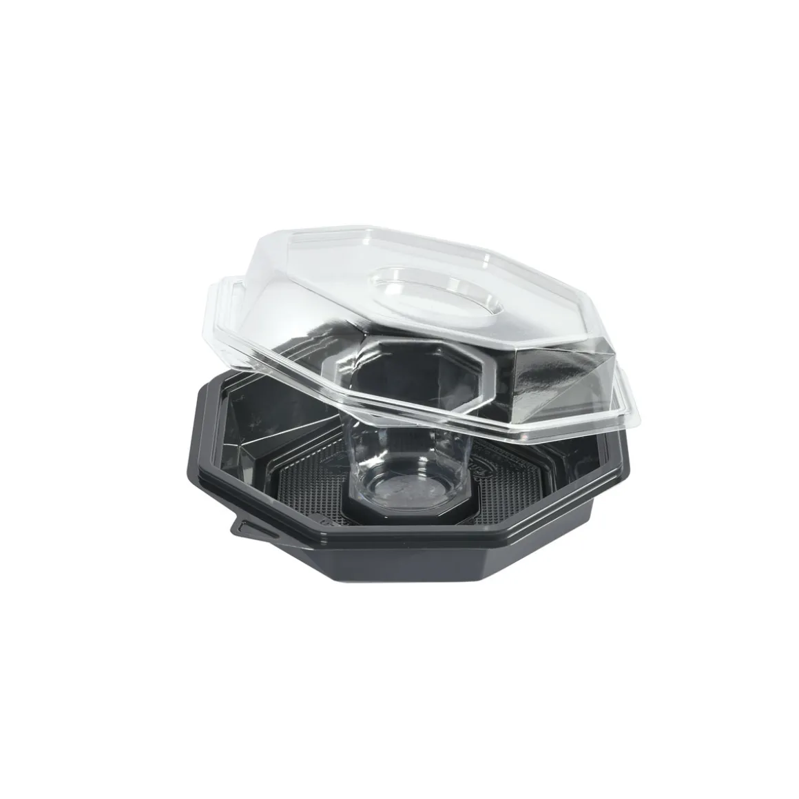 Die Octaview-Take-away-Box schützt frische, kalte Speisen und präsentiert sie gleichzeitig optimal – aus Respekt vor den Lebensmitteln und den Menschen, die sie zubereiten. Sie wurde für Lebensmitteleinzelhändler, Caterer und Feinkosttheken entwickelt und verfügt über einen kristallklaren, beschlagfreien Deckel und einen großen, dunkelgrauen Bereich, der Salate, Sushi, Meeresfrüchte und Wurstwaren hochwertig in Szene setzt. Octaview wird aus APET ohne Ruß hergestellt und reduziert die CO₂-Emissionen um bis zu 78 % über die gesamte Produktpalette hinweg*, wodurch die Sorgfalt im Umgang mit Lebensmitteln mit einer geringeren Umweltbelastung verbunden wird.