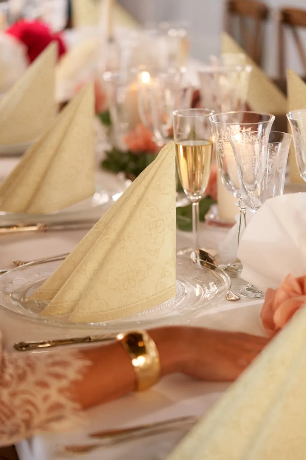 Großzügig in Format und Stimmung. Ein maximales Erlebnis für Gäste – sowie in Sachen Hygiene und Praktikabilität. In Optik und Haptik nicht von Stoff zu unterscheiden. Elegant geprägt, weich, dick und perfekt zu falten. Kompostierbar.