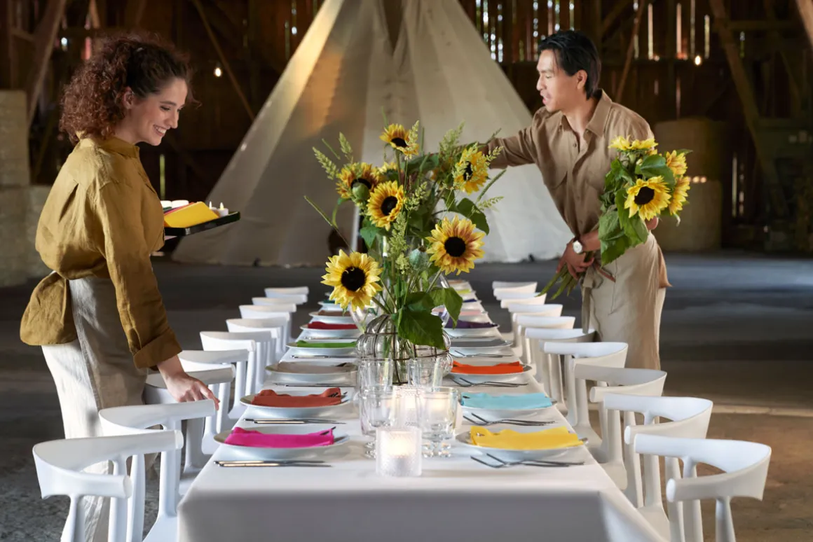 Großzügig in Format und Stimmung. Ein maximales Erlebnis für Gäste – sowie in Sachen Hygiene und Praktikabilität. Herrlich weich, für farbenfrohe Momente. Sehr saugfähig, hält einem mehrgängigen Menü stand. Optimales Preis-Leistungs-Verhältnis für legere Anlässe. Kompostierbar.