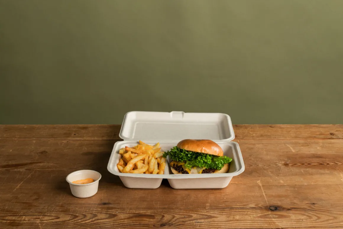 Unsere Boxen mit anhängendem Klappdeckel sind die optimale Wahl für Fast-Food. Sie werden aus erneuerbaren und kompostierbaren Zuckerrohrfasern (Bagasse) hergestellt und sind ebenso nachhaltig wie praktisch. Es gibt sie in verschiedenen Größen und mit unterschiedlichen Fachgrößen, was Zubereitung und Servieren denkbar einfach macht. Unsere Speiseverpackungen – wie all unsere Boxen und Schalen – werden ohne Zusatz von PFAS hergestellt.