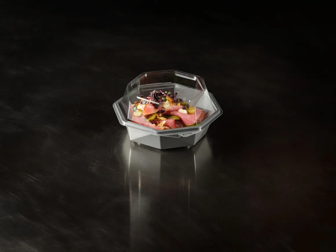 Die Octaview-Take-away-Box schützt frische, kalte Speisen und präsentiert sie gleichzeitig optimal – aus Respekt vor den Lebensmitteln und den Menschen, die sie zubereiten. Sie wurde für Lebensmitteleinzelhändler, Caterer und Feinkosttheken entwickelt und verfügt über einen kristallklaren, beschlagfreien Deckel und einen großen, dunkelgrauen Bereich, der Salate, Sushi, Meeresfrüchte und Wurstwaren hochwertig in Szene setzt. Octaview wird aus APET ohne Ruß hergestellt und reduziert die CO₂-Emissionen um bis zu 78 % über die gesamte Produktpalette hinweg*, wodurch die Sorgfalt im Umgang mit Lebensmitteln mit einer geringeren Umweltbelastung verbunden wird.