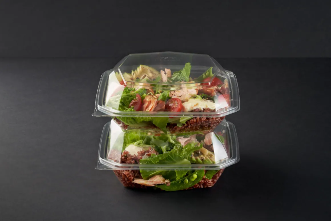 Die RPET Octaview-Serie setzt durch das beliebte und bewährte Design Speisen perfekt in Szene. Diese kristallklaren Take-away-Schalen für kalte Speisen beschlagen nicht und ermöglichen Ihren Kunden eine perfekte Sicht auf die Speisen – aus jedem Blickwinkel. Mit seinem anhängenden und auslaufsicheren Deckel ist eine einfache Handhabung garantiert, was ihn zur hervorragenden Lösung für unterwegs macht. Sie bestehen zu 100 % aus post-consumer recyceltem PET (RPET) und können nach Gebrauch dem Gebrauch problemlos wieder recycelt werden.